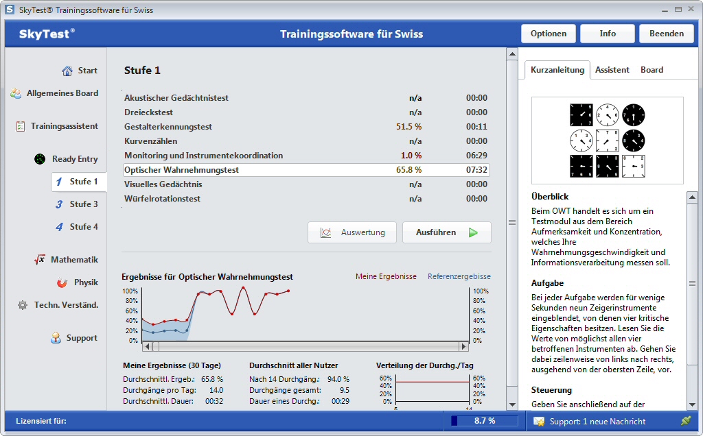 Die SkyTest® Trainingssoftware für Swiss 3 bietet eine Reihe zusätzlicher Funktionen, die Ihnen ein effizientes und zielführendes Training zu ermöglichen. Die Software ist zudem zweisprachig (deutsch und englisch); die eingestellte Sprache kann jederzeit geändert werden.